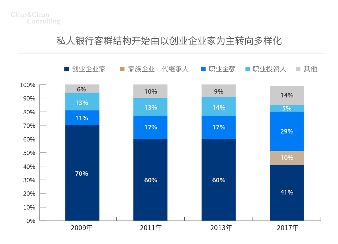 我国中资私人银行业务起步于2007年,市场格局2014年开始加速分化,以招商银行和工商银行为代表的先行者,正在不断拉大与其他竞争者的差距。从服务情况看,国内私行提供的产品种类较少、产品定制化程度较低、过于侧重资产管理,服务多元化程度较低。从客户结构看,私人银行客群结构开始由以创业企业家为主转向多样化。
