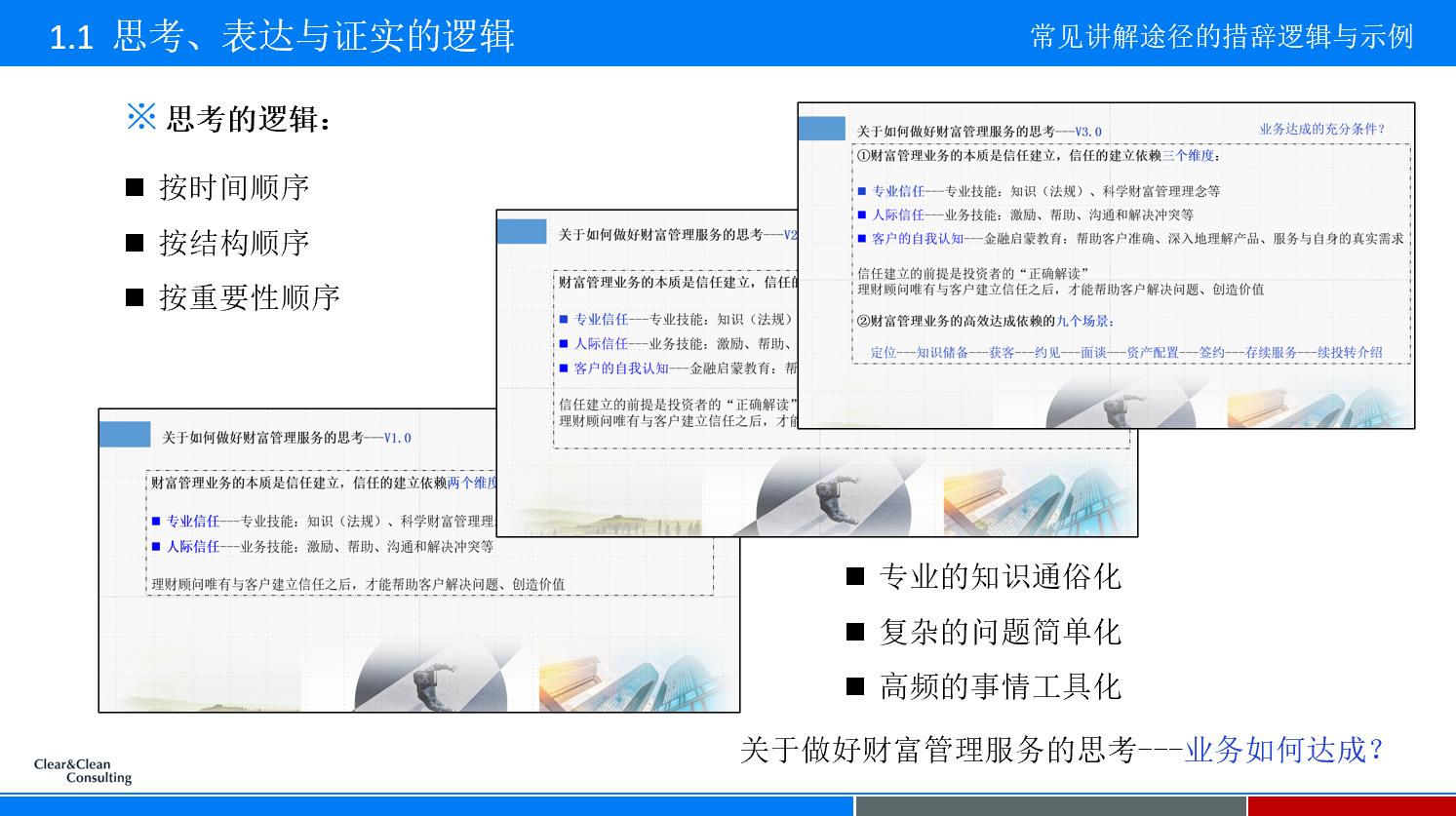 财富管理服务,产品是核心中的核心,投资者“听得懂”才好做决定。因此,如下三点不可谓不重要:理清理财产品讲解的主要逻辑,认识到服务非专业投资者时从“资产管理”到“财富管理”话语体系转换的重要性,并养成“复杂的事情简单化、专业的知识通俗化、高频的问题工具化”的基本讲解习惯。
