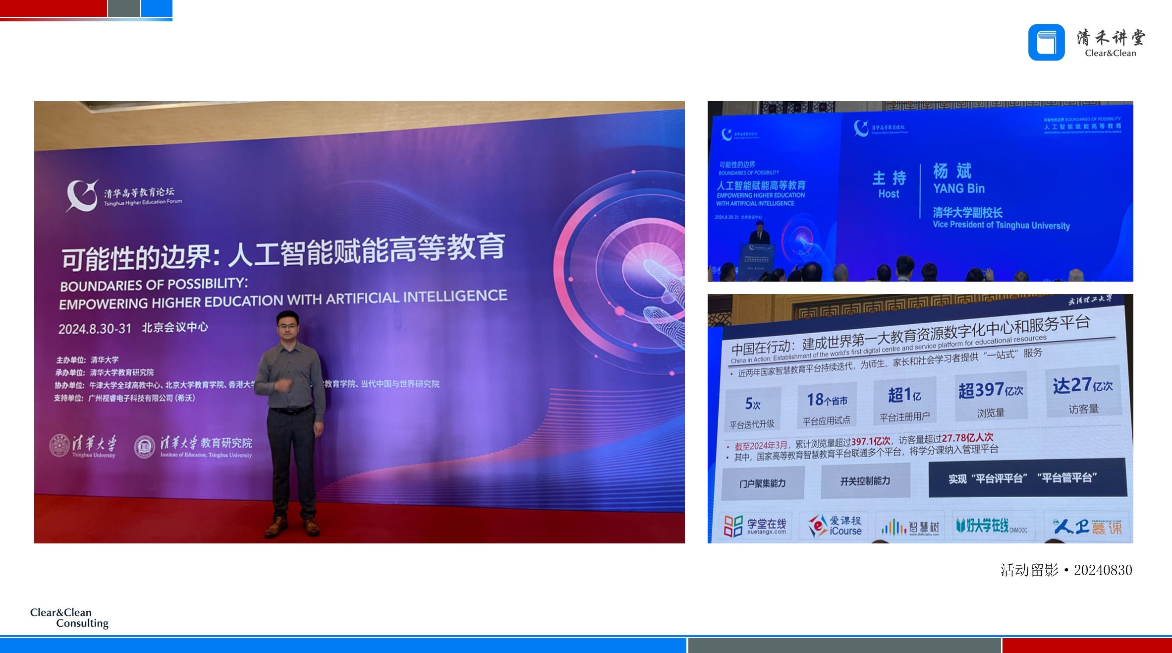 2024年8月30至31日,清禾咨询参加清华高等教育论坛,本届论坛主题为《可能性的边界:人工智能赋能高等教育》。随着生成式人工智能(generative AI)横空出世,在全球范围内掀起了有史以来规模最大的人工智能热潮。如今,生成式人工智能已然成为当今最炙手可热的前沿科技,它们在赋能高等教育的同时,也为高等教育的变革提供了无数的可能性,让我们对重新构想一个引领未来的高等教育充满期待。