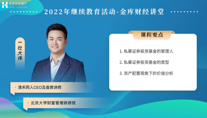 2022年11月10日起,杜大伟老师讲授《私募证券投资基金全解析》主题课程,共8章18小节,帮助理顾看懂私募产品,明辨不同类型私募证券基金的风险收益特征;学会价值评测,掌握为投资者甄选私募证券基金的一般标准;认识资产配置,理解投资者配置私募证券基金的必要性与局限性。